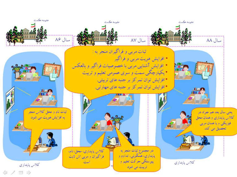 تلاش براي آن است كه محيط كلاس از محيط يكسويه معلم محور، به سمت محيط تعاملي تغيير كند. شكلهای زیر، نمونه‌هائي از اين محيط را كه در كلاس حكمت (پايلوت اوليه طرح) اجرا شده است نشان مي‌دهد.